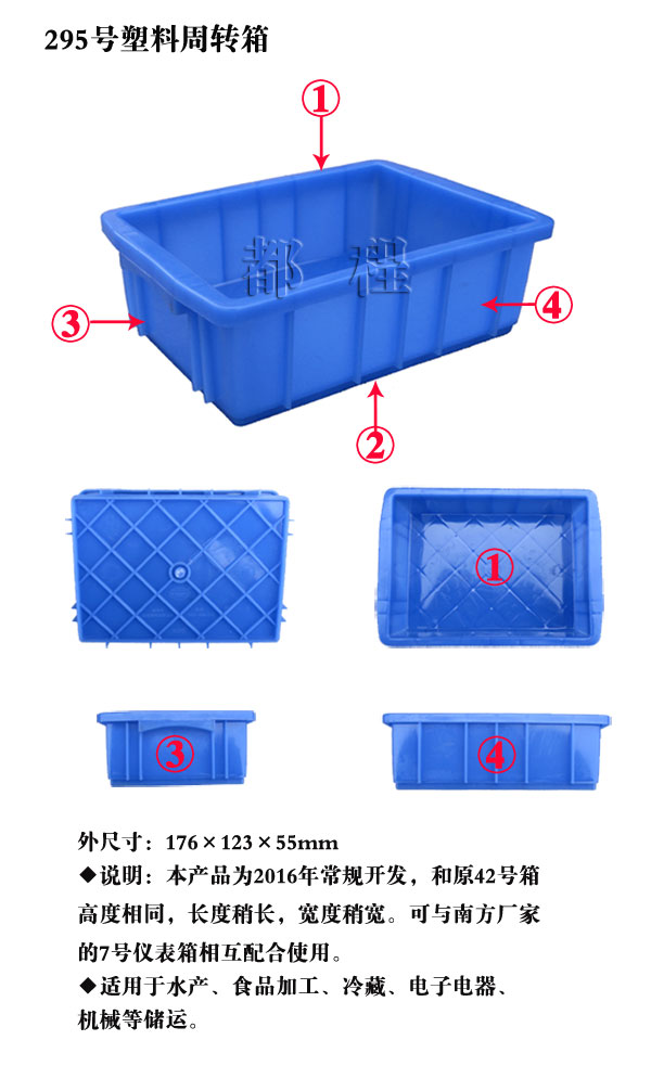編號(hào): X295 外尺寸(mm): 176*123*55 內(nèi)尺寸(mm): 155*110*50 內(nèi)容積(L): 5.5 備注: 適用于水產(chǎn)、食品加工、冷藏、電子電器、機(jī)械等儲(chǔ)運(yùn)。