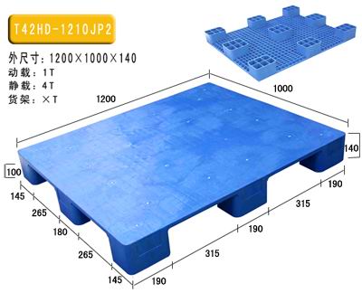 產(chǎn)品型號(hào): HD-1210JP2 產(chǎn)品貨號(hào): T42 產(chǎn)品外尺寸: 1200×1000×140 產(chǎn)品內(nèi)尺寸: 產(chǎn)品結(jié)構(gòu): 九腳平板 產(chǎn)品內(nèi)容量(L): 承重量(T): 動(dòng)載:1T 靜載:4T 貨架:X 產(chǎn)品認(rèn)可標(biāo)準(zhǔn): 此款塑料托盤(pán)適用平地墊倉(cāng)使用,防潮效果好,且易于清洗;