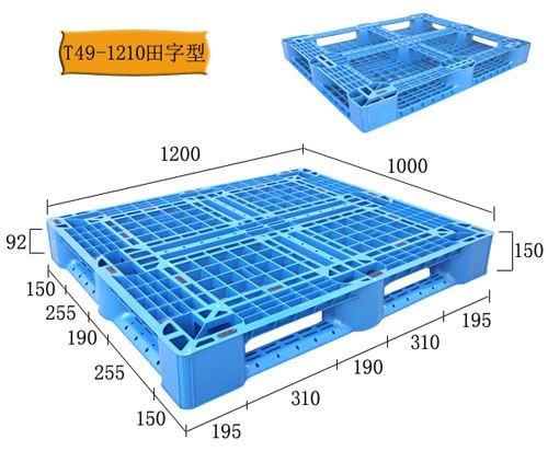 產(chǎn)品型號(hào): HD-1210TW2 產(chǎn)品貨號(hào): T49 產(chǎn)品外尺寸: 1200×1000×150 產(chǎn)品內(nèi)尺寸: 產(chǎn)品結(jié)構(gòu): 單面網(wǎng)格 產(chǎn)品內(nèi)容量(L): 承重量(T): 動(dòng)載:1T 靜載:4T 貨架:0.6T 該塑料托盤適合平地墊倉、碼垛和上貨架使用;