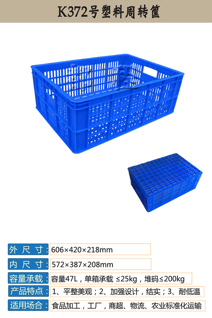 編號(hào): 372 外尺寸(mm): 606*420*218 內(nèi)尺寸(mm): 572*387*208 內(nèi)容積(L): 47 備注: 適用于食品廠、商超、物流、農(nóng)業(yè)標(biāo)準(zhǔn)化運(yùn)輸。